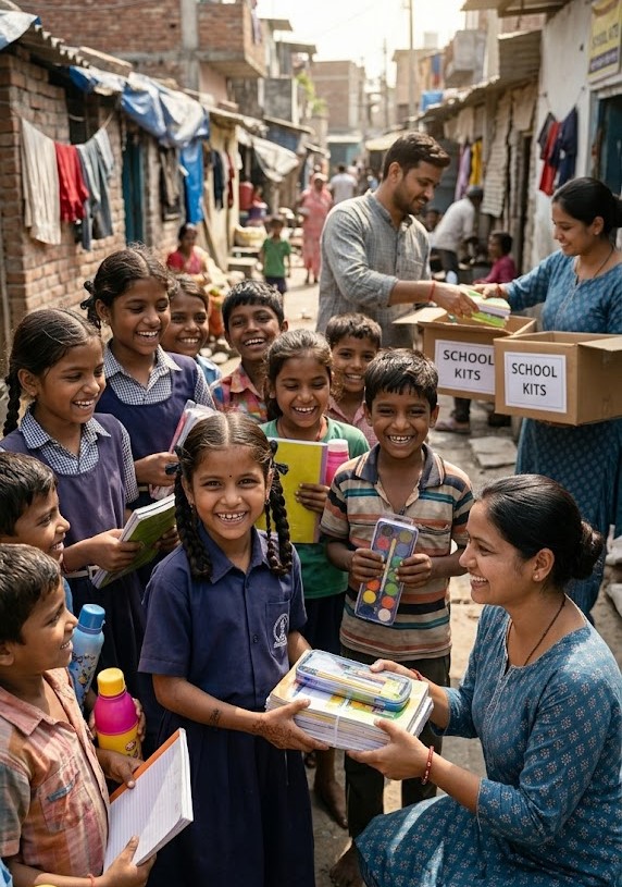 We help economically weaker students with fees, books, and uniforms, and also empower women through skill development programs like stitching and beautician training.